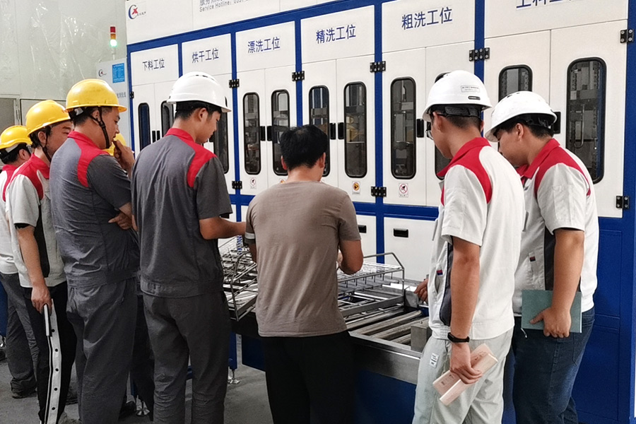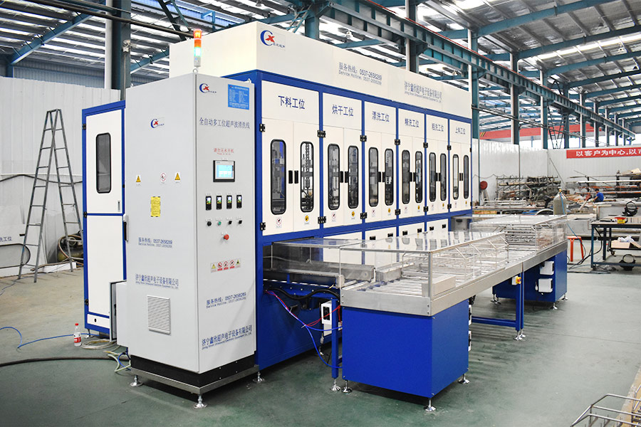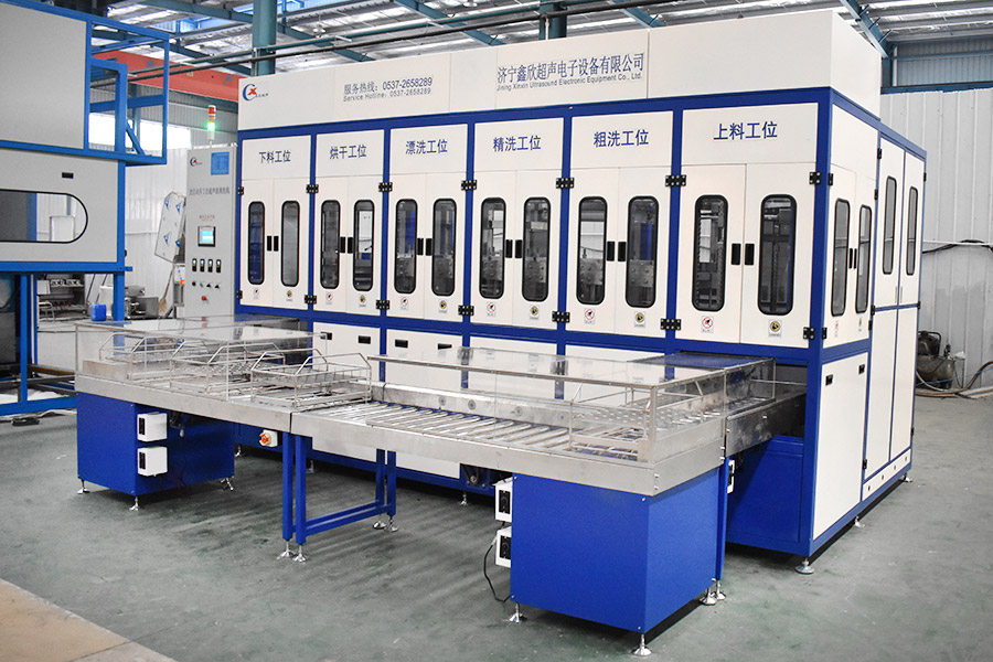 該設(shè)備有自動(dòng)上下料及轉(zhuǎn)角系統(tǒng)、超聲波清洗系統(tǒng),自動(dòng)拋動(dòng)、自動(dòng)溢流和油污分離裝置,噴淋系統(tǒng)、自動(dòng)高壓切水系統(tǒng)、自動(dòng)烘干系統(tǒng)。機(jī)械手自動(dòng)輸送系統(tǒng)采用高精度直線導(dǎo)軌配合高精度位置檢測傳感器,機(jī)械手可以準(zhǔn)確的實(shí)現(xiàn)工件的抓取和放置。自動(dòng)進(jìn)排液和自動(dòng)加溫系統(tǒng)完全實(shí)現(xiàn)了無人干預(yù),自動(dòng)運(yùn)行,很大地程度上降低了工人的勞動(dòng)強(qiáng)度。先進(jìn)的霧氣處理系統(tǒng)可以將清洗時(shí)產(chǎn)生的霧氣冷凝回流,空氣經(jīng)過濾和活性炭吸附后排出。