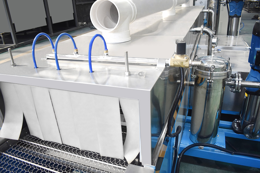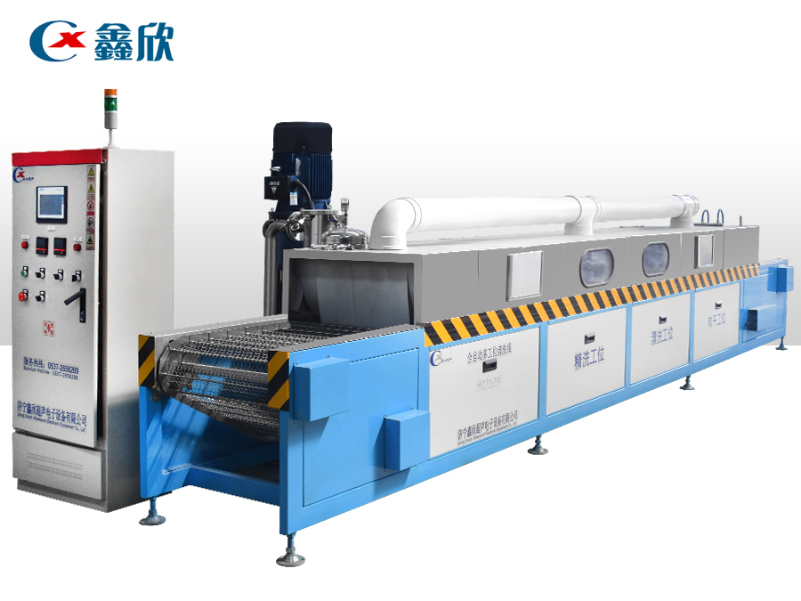 該設(shè)備有上下料網(wǎng)帶、超聲波清洗工位、噴淋漂洗工位、高壓風切、熱風烘干工位、溫控水加熱系統(tǒng)、風機、溫控空氣加熱系統(tǒng)、移動式風刀、PLC+觸摸屏控制系統(tǒng)、管路系統(tǒng)及智能電器控制系統(tǒng)等組成。自動進排液和自動加溫系統(tǒng)完全實現(xiàn)了無人干預(yù),自動運行,很大程度上降低了工人的勞動強度。先進的霧氣處理系統(tǒng)可以將清洗時產(chǎn)生的霧氣冷凝回流,空氣經(jīng)過濾和活性炭吸附后排出。