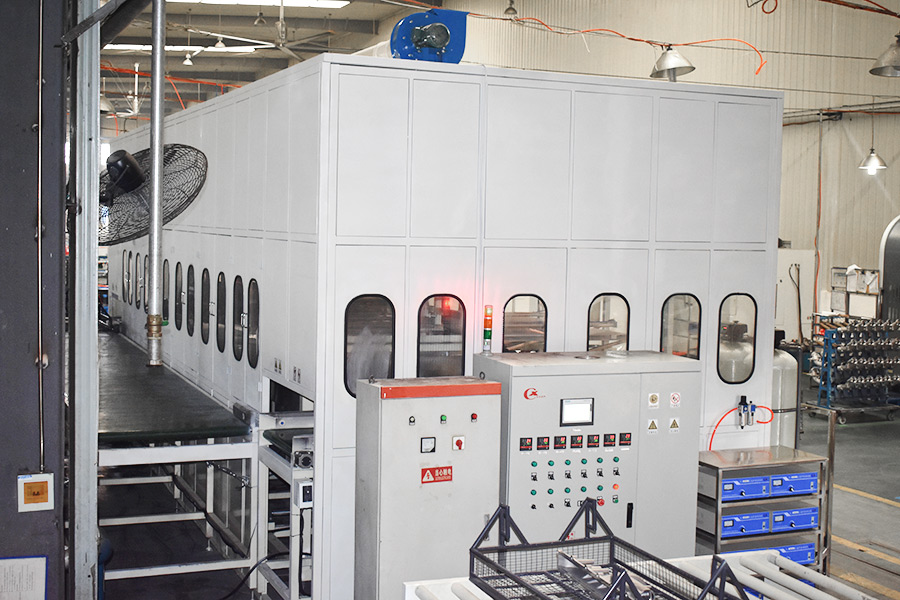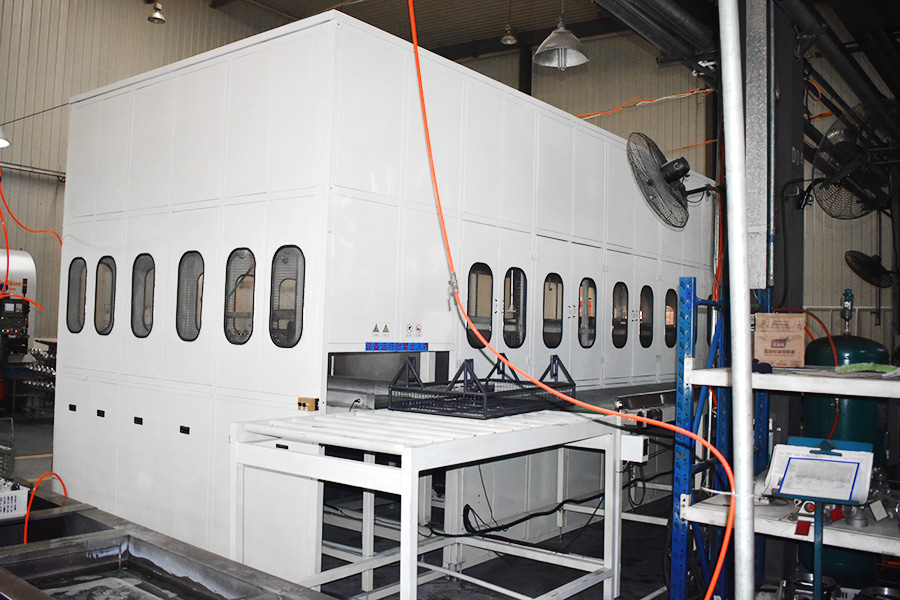 該設(shè)備有自動上下料及轉(zhuǎn)角系統(tǒng)、超聲波清洗系統(tǒng),自動拋動、自動溢流和油污分離裝置,噴淋系統(tǒng)、自動高壓切水系統(tǒng)、自動烘干系統(tǒng)。機(jī)械手自動輸送系統(tǒng)采用高精度直線導(dǎo)軌配合高精度位置檢測傳感器,機(jī)械手可以準(zhǔn)確的實現(xiàn)工件的抓取和放置。自動進(jìn)排液和自動加溫系統(tǒng)完全實現(xiàn)了無人干預(yù),自動運(yùn)行,很大程度上降低了工人的勞動強(qiáng)度。先進(jìn)的霧氣處理系統(tǒng)可以將清洗時產(chǎn)生的霧氣冷凝回流,空氣經(jīng)過濾和活性炭吸附后排出。